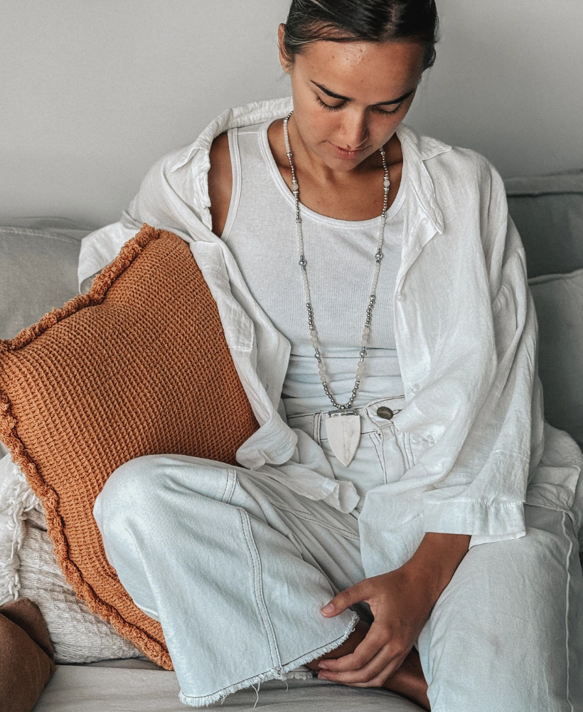 Pieza hecha a mano con dije de hueso pulido en forma de flecha, bolitas de metal, vidrio y piedra de cuarzo blanco. Mide 89 cm de contorno total. El cuerno aparte mide 7 cm de largo x 4,3 cm de ancho.