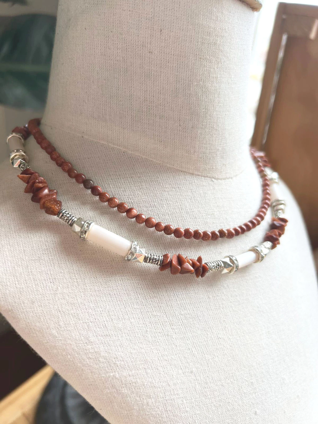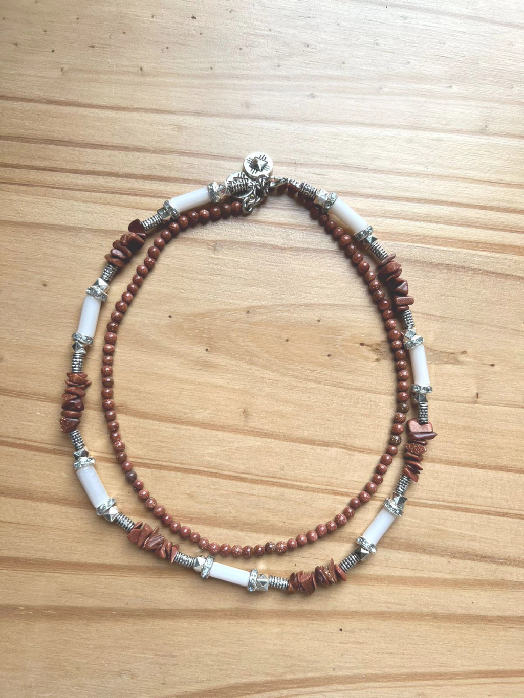 Collar hecho con escallas de piedra sol, tubitos de vidrio y cuentas metal. Mide 42 cm de contorno. Queda divino con la gargantilla de piedra sol.