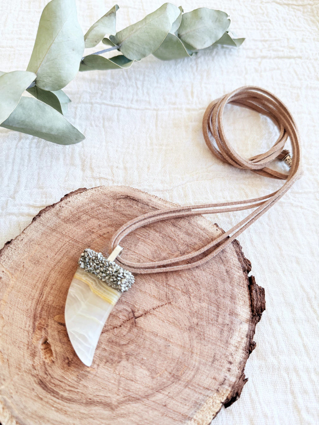 Hecho a mano con un cuerno de piedra natural ágata engarzado en pirita y detalles de metal, combinado con un cordón de símil gamuza con cierre regulable para adaptarlo al largo deseado.