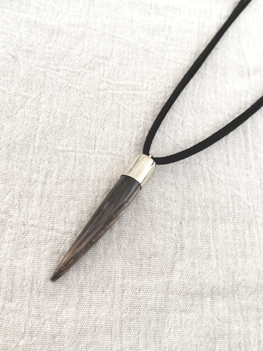 Hecho a mano con cordón y un dije de cuerno de asta engarzado en alpaca, que combina la textura natural con el brillo metálico. Posee cierre regulable para adaptarlo al largo deseado, ofreciendo versatilidad al usarlo.