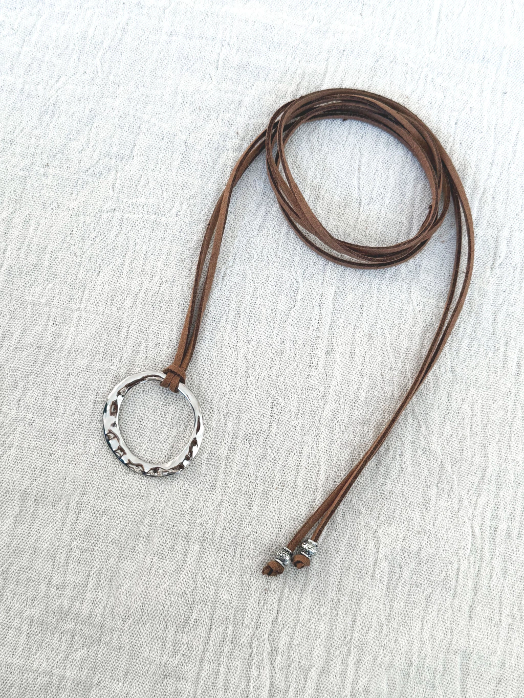 El Collar Lazo Argolla combina elegancia y simpleza artesanal. Realizado con un dije metálico de argolla irregular con textura de ondas, evoca el fluir del agua y la belleza de las formas orgánicas. Su cordón de gamuza de 1,5 m permite usarlo largo, doble o tipo lazo, adaptándose a distintos estilos.