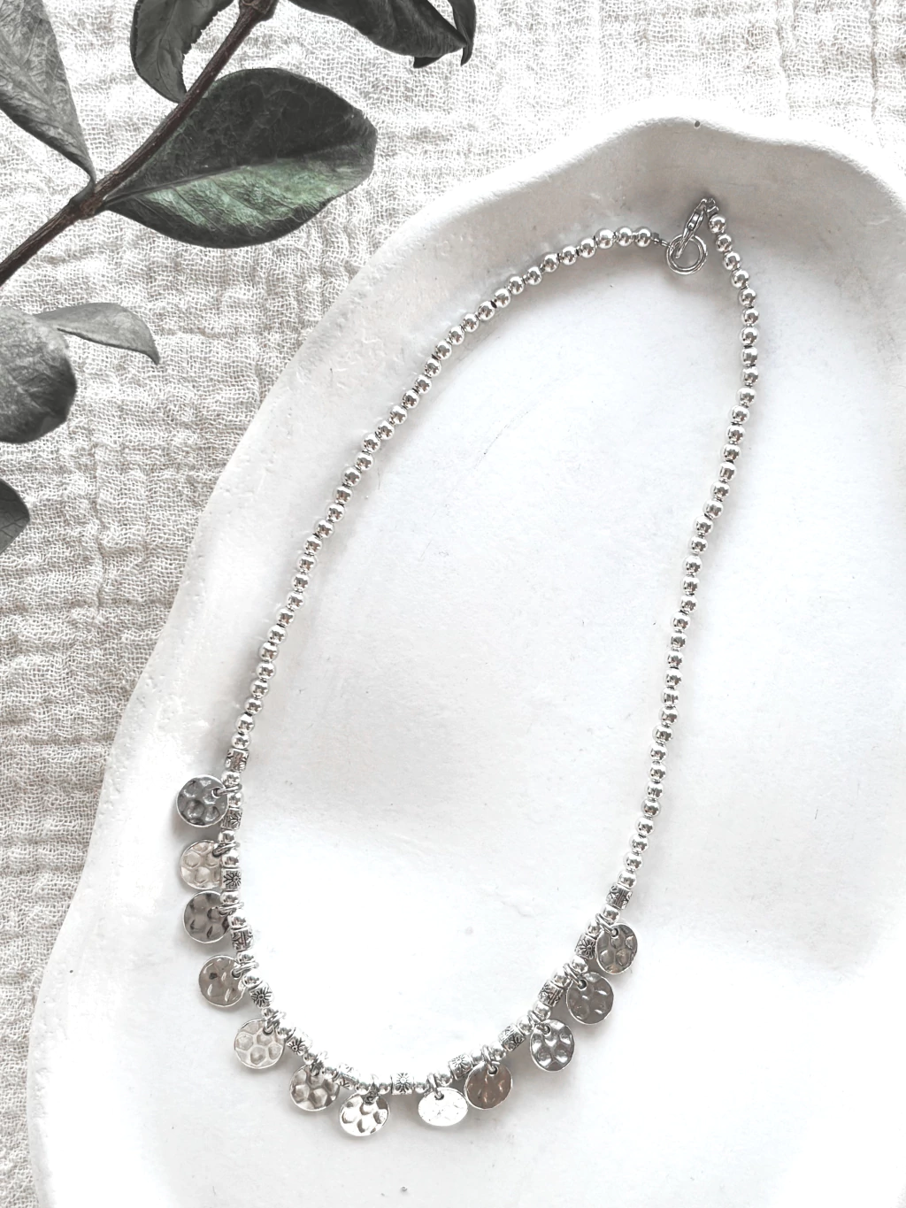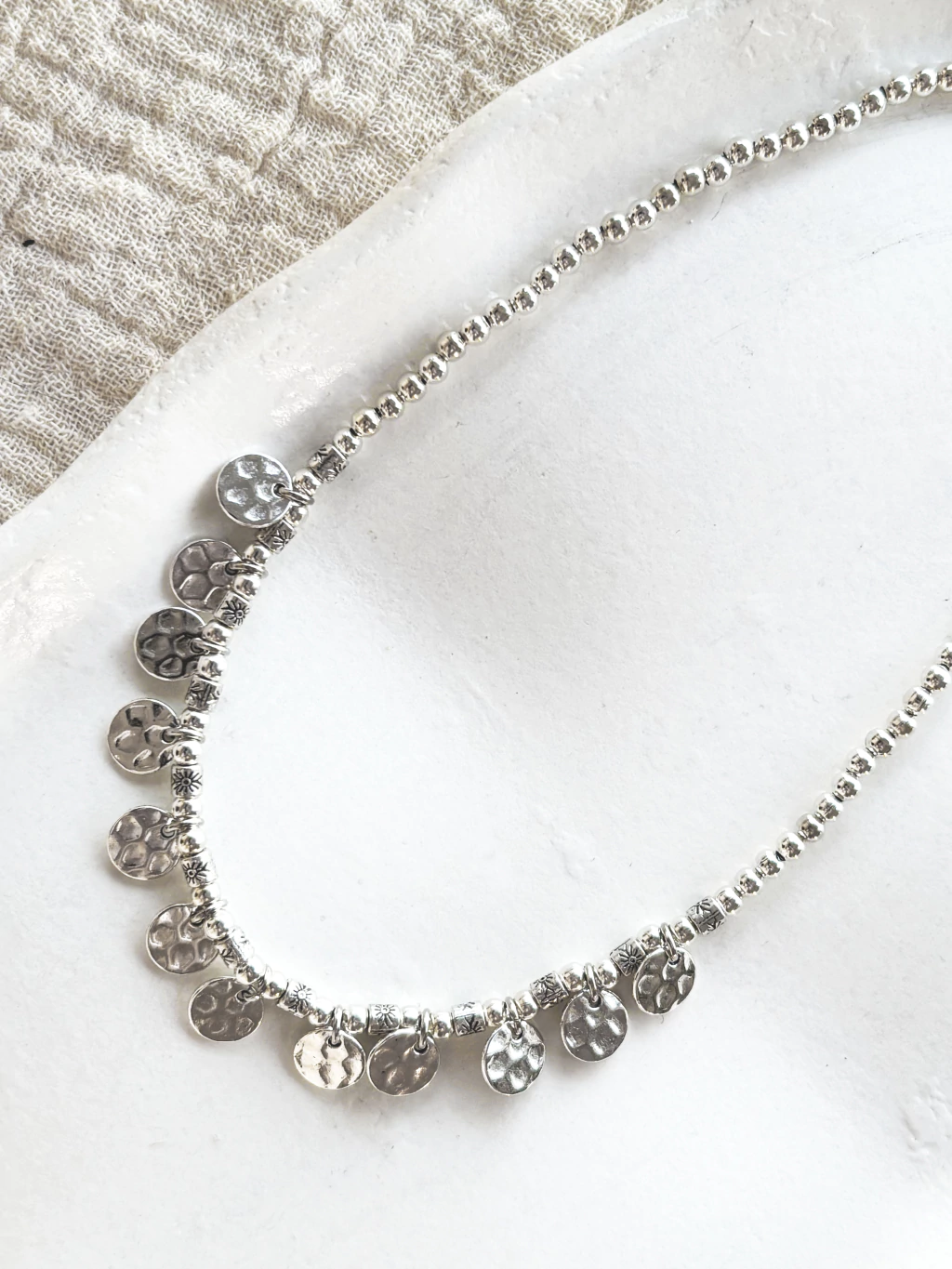 Hecho a mano con cuentas y delicados dijes de moneditas circulares que aportan movimiento y brillo sutil. Un diseño versátil, perfecto para combinar con otros accesorios y crear capas con estilo.