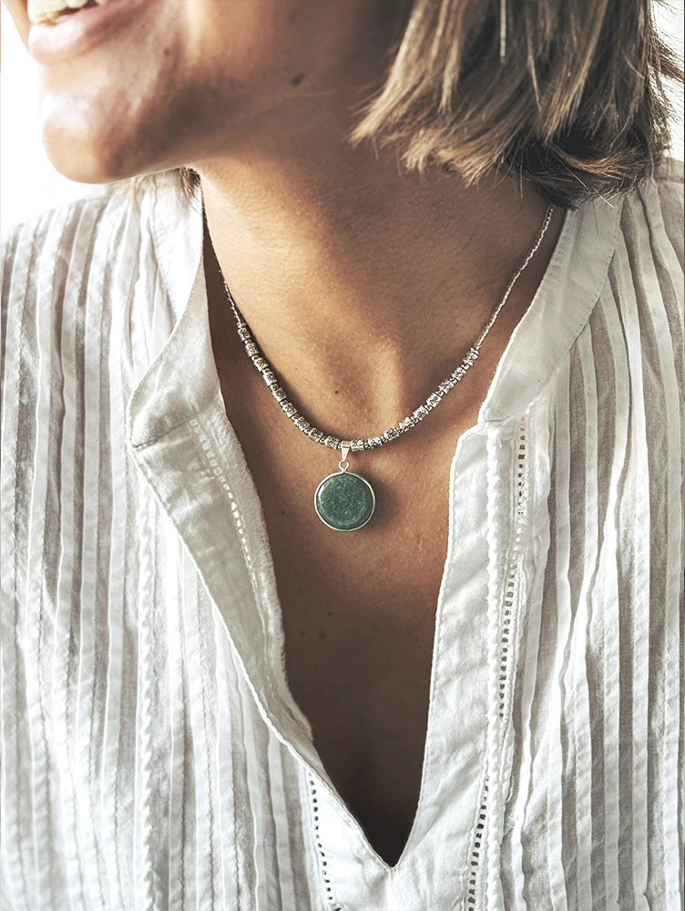 Hecha a mano con mostacillas y cuentas de metal de fundición labradas. Destaca un dije de piedra natural con baño de plata mediante electroplay, disponible en cinco variantes: Cuarzo blanco,Cuarzo Verde, y Onix Negra.