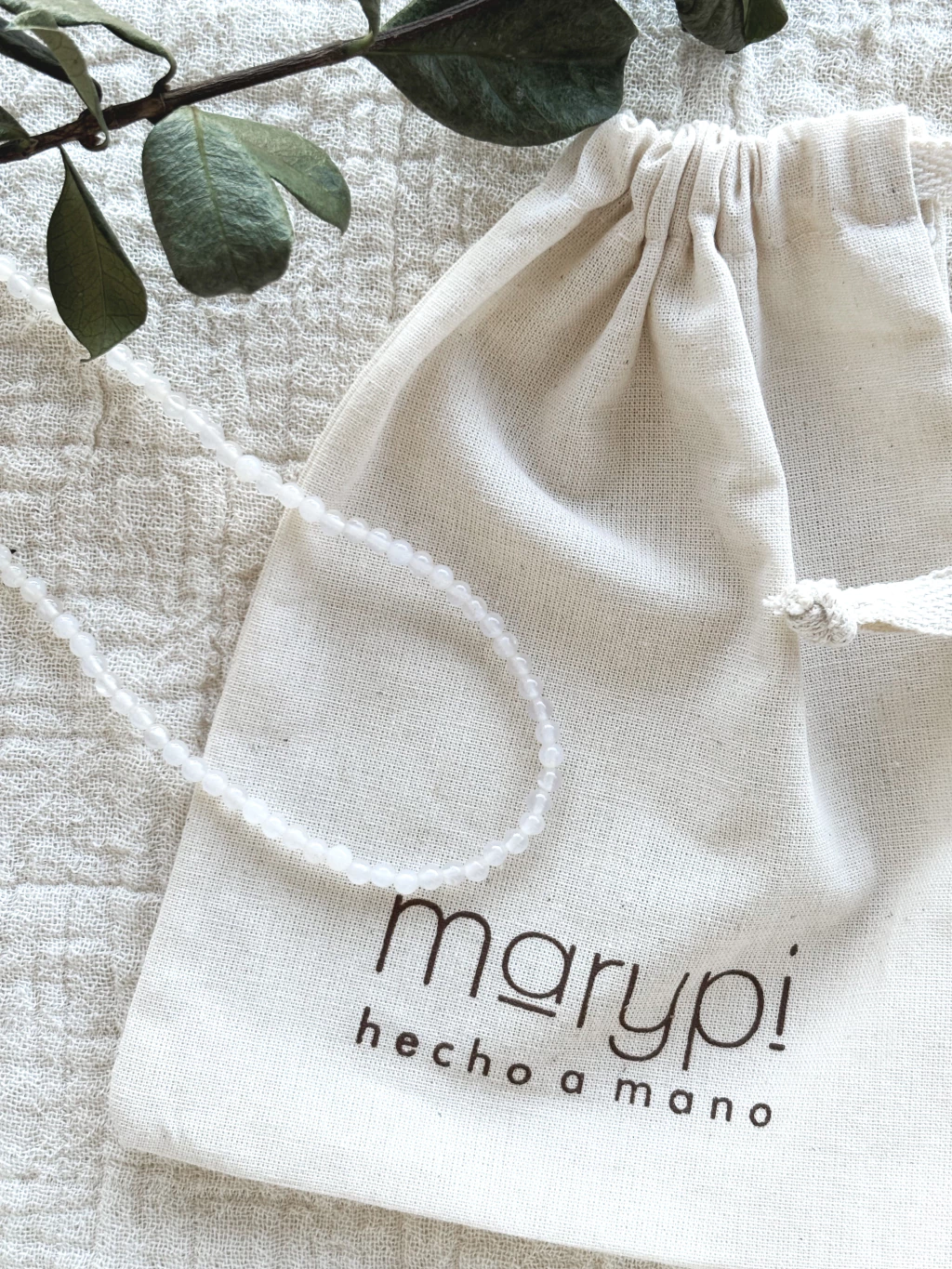 Hecha a mano con cuentas de piedra natural Cuarzo Blanco número 4, de tonos suaves y translúcidos que aportan delicadeza. Incluye cierre y detalles de metal de fundición resistentes.