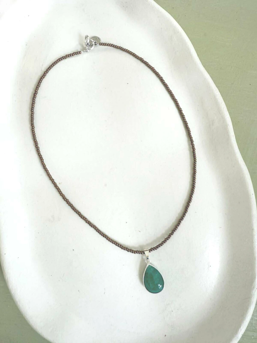 Hecha a mano con mostacillas finas y un dije en forma de gota de piedra natural amazonita, en tonos verdes y azules suaves que transmiten frescura y armonía. Un diseño delicado y femenino que resalta por su sutil elegancia.