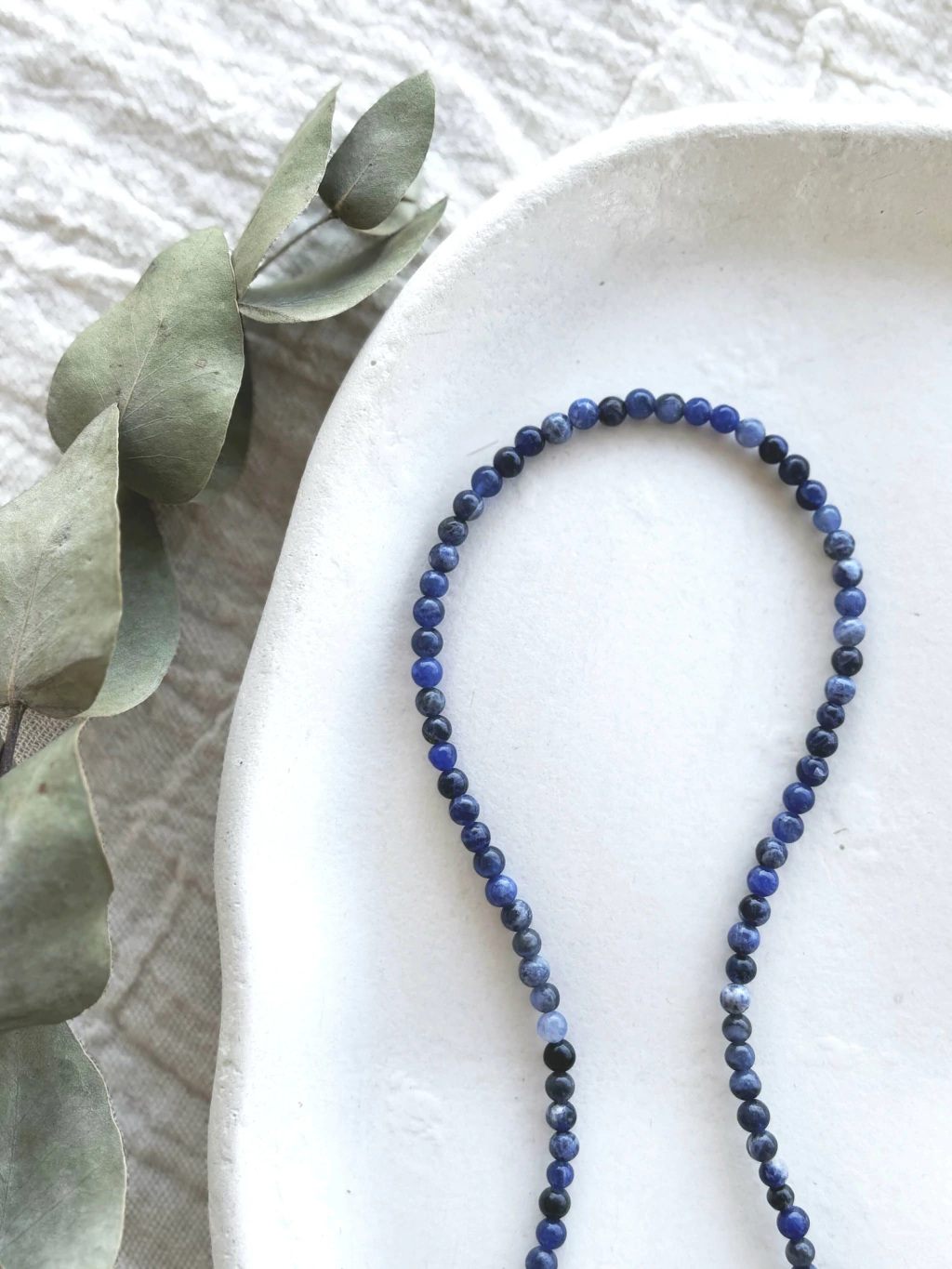 Está confeccionada con cuentas de piedra natural sodalita, de tonos azules profundos con vetas únicas.
