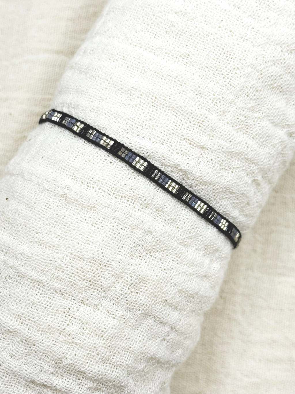 La Pulsera Etnia Negra combina elegancia y energía artesanal. Tejida tipo telar con mostacillas en tonos negros, plateados y dorados, refleja la sofisticación de los colores neutros y metálicos. Su textura delicada y brillo sutil la hacen perfecta para usar sola o acompañar otras pulseras.